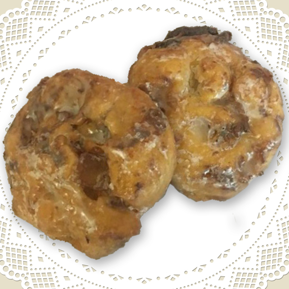 Our Apple Fritters start out as a small ball of dough with a generous amount of cinnamon and apple chips worked in. They are then finished off to a state of perfection. The Apple Fritter has become one of our top-selling items. My personal favorite is the one with the most "nooks and crannies"!!!
